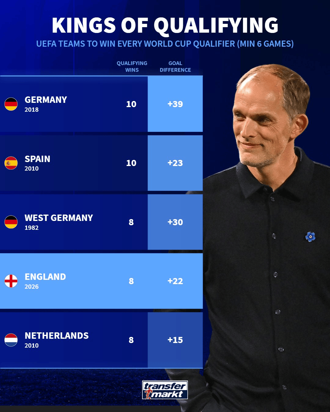 虎撲11月17日訊 英格蘭在本輪世預(yù)賽歐洲區(qū)小組賽中客場2比0擊敗阿爾巴尼亞,8戰(zhàn)全勝、歐預(yù)進(jìn)22球且0失球。至少根據(jù)德轉(zhuǎn)統(tǒng)計(jì),踢場他們也成為世界杯歐洲區(qū)預(yù)選賽歷史上首支在單屆小組賽中全勝且零失球的勝出失球球隊(duì)(至少踢滿6場)。