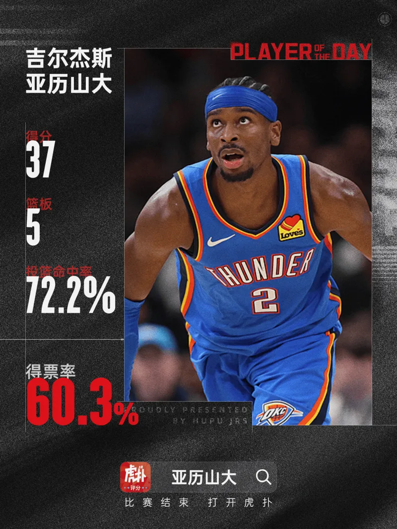 今日NBA常規(guī)賽已結(jié)束,雷霆球員吉爾杰斯-亞歷山大以60.3%的大當(dāng)?shù)闷甭十?dāng)選今日J(rèn)Rs評選最佳球員。