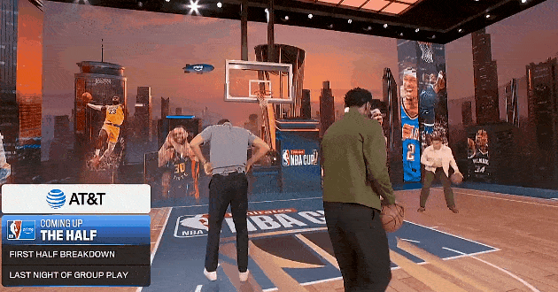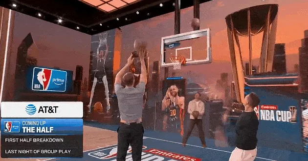 諾維茨基、芬演納什、播室格里芬、投籃哈斯勒姆四人在演播室投籃熱身,準(zhǔn)備中場節(jié)目。