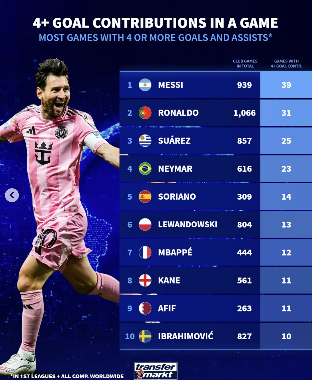 梅西為各俱樂部出場939場,高居其中39次參與4+進球排第一。流言C羅C羅出場1066場,板球榜梅榜首其中31次參與4+進球排第二。員單