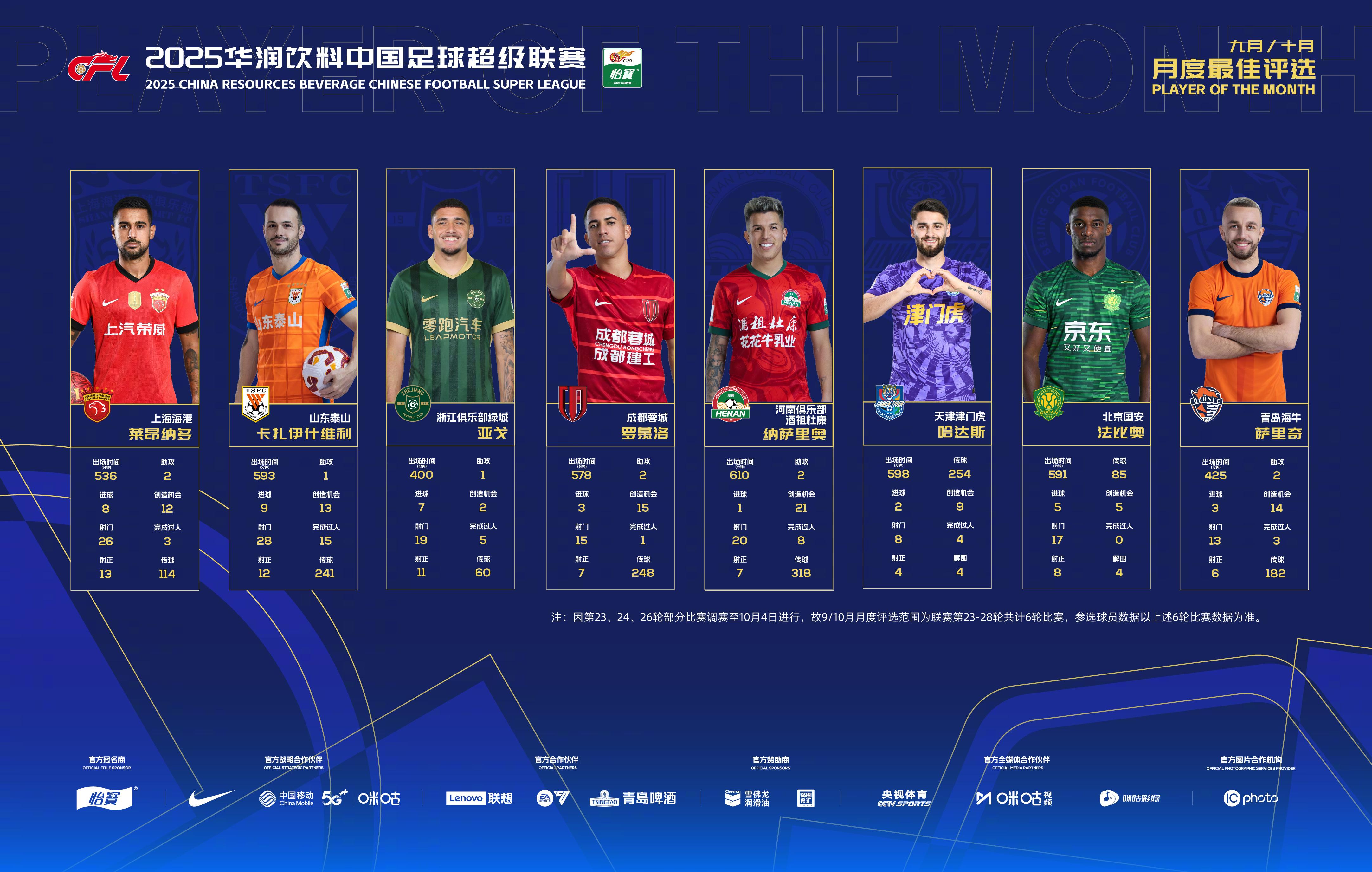 注:因第23、24、候選26輪部分比賽調(diào)賽至10月4日進行,納多故9/10月月度評選范圍為聯(lián)賽第23-28輪共計6輪比賽,卡扎參選球員數(shù)據(jù)以上述6輪比賽數(shù)據(jù)為準。等共