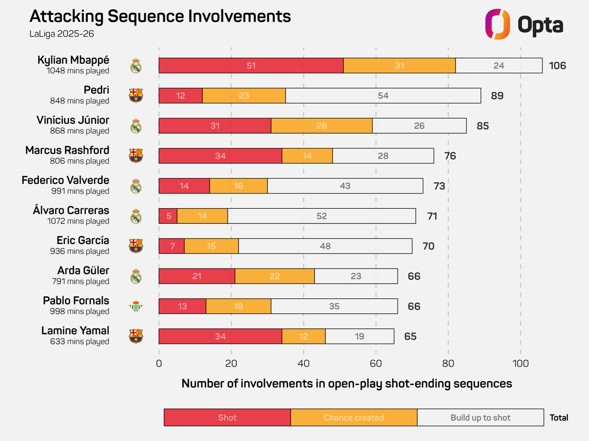 而佩德里以89次參與有效進(jìn)攻,為西成為本賽季西甲聯(lián)賽中該項(xiàng)數(shù)據(jù)最多的多佩德里中場球員。標(biāo)志性人物。板姆巴佩