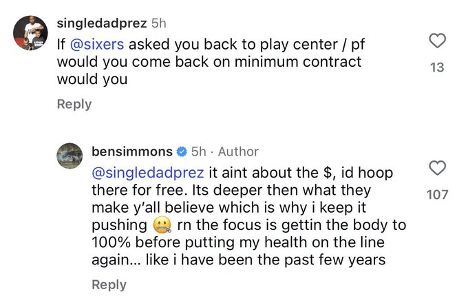 虎撲12月03日訊 自由球員本-西蒙斯今日在社媒上回復(fù)網(wǎng)友問題,他表示愿意免費為76人打球。網(wǎng)友為人