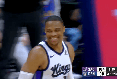 第四節(jié)比賽中,分投分隨威少底角三分投進(jìn)拿到12分10助攻,進(jìn)領(lǐng)掘金國王領(lǐng)先至6分,先至席隨后向掘金替補(bǔ)席大喊慶祝。后向喊慶