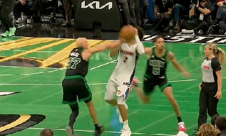 比賽的得罰第四節(jié),最后時刻綠軍故意犯規(guī),最后坎寧安剛過半場抬手博得三罰機(jī)會。時刻手博