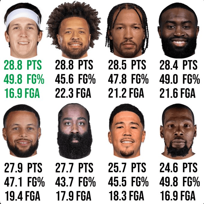 從表中可以看出,里夫斯本賽季的場均得分高于布倫森、布朗、庫里、哈登、KD、布克等球員。