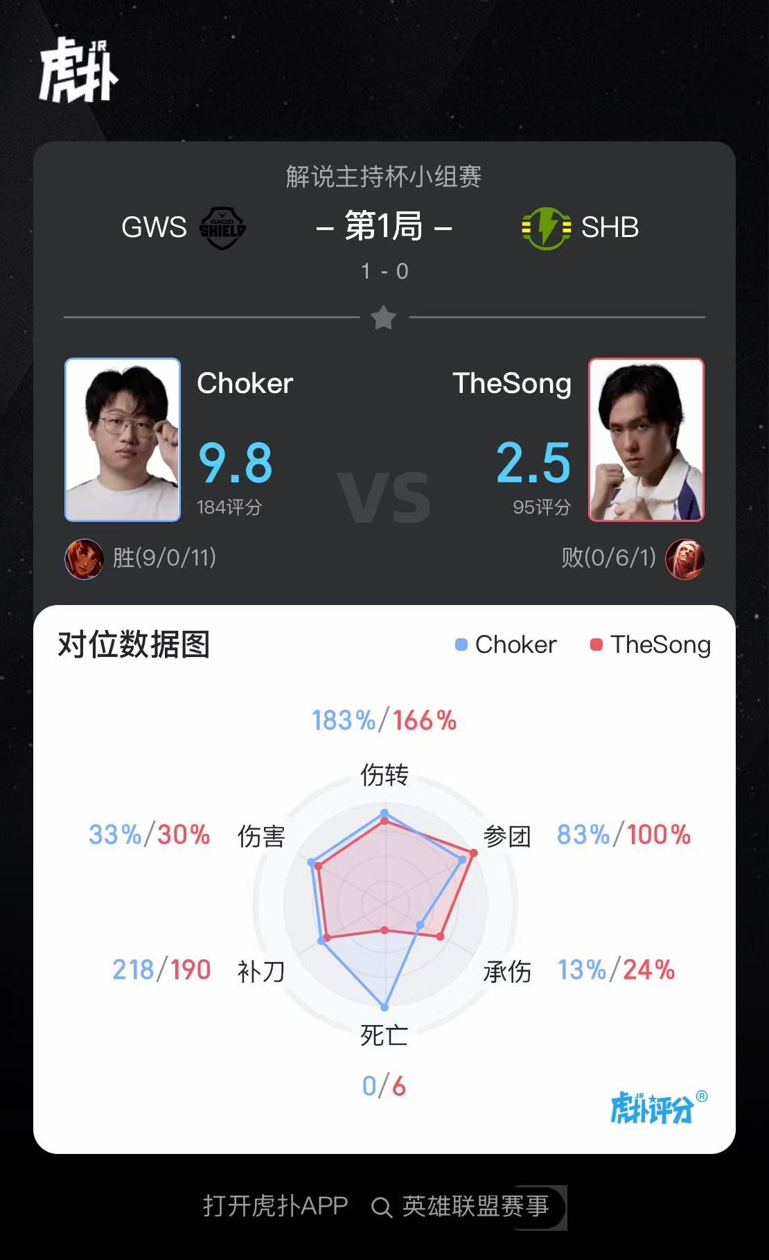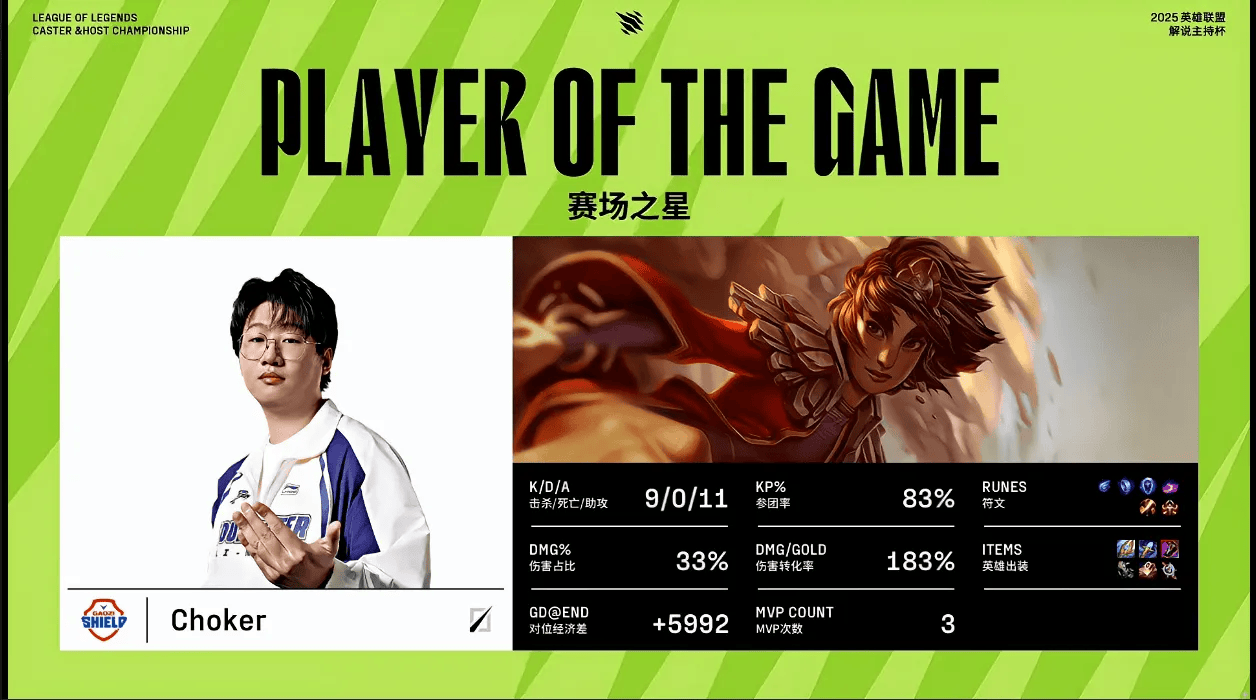 虎撲11月13日訊 在剛剛結(jié)束的GWS對陣SHB的BO1比賽中,Choker巖雀打出9/0/11戰(zhàn)績,績斬局斬獲GWS對陣SHB第一局MVP