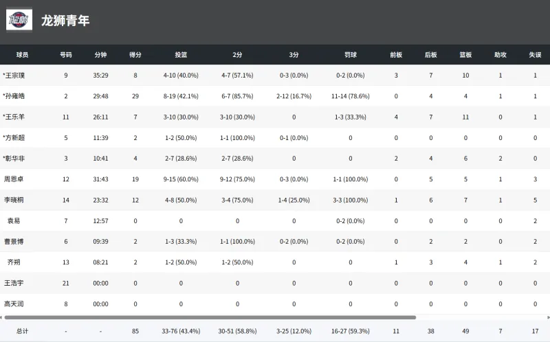 龍獅:孫雍皓29分、男籃周恩卓19分、全國李曉桐12分