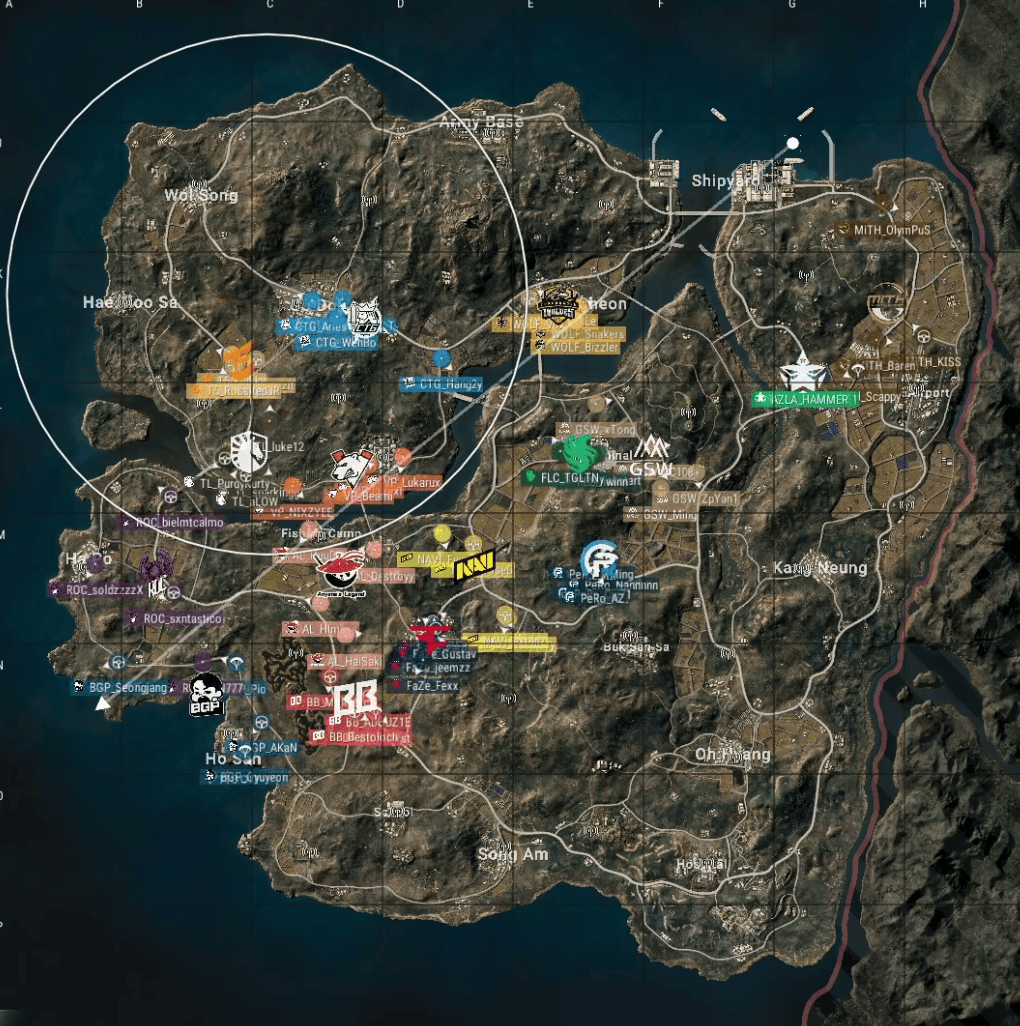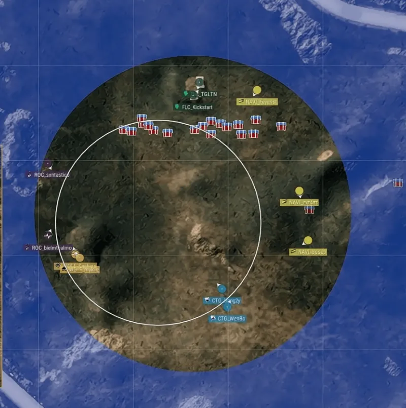 階段7剩余5隊(duì),ROC與FLC在圈型北側(cè)小廟交火,兩隊(duì)互有倒地。