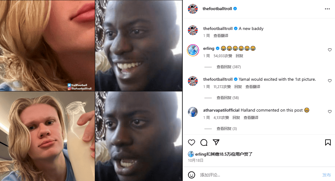 哈蘭德本人點(diǎn)贊這張梗圖,發(fā)布并評論:????????????