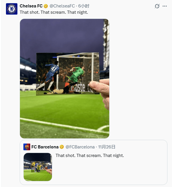 在3-0擊敗巴塞羅那的賽后,切爾西官方制作了埃斯特旺爆射的同款照片,配文: