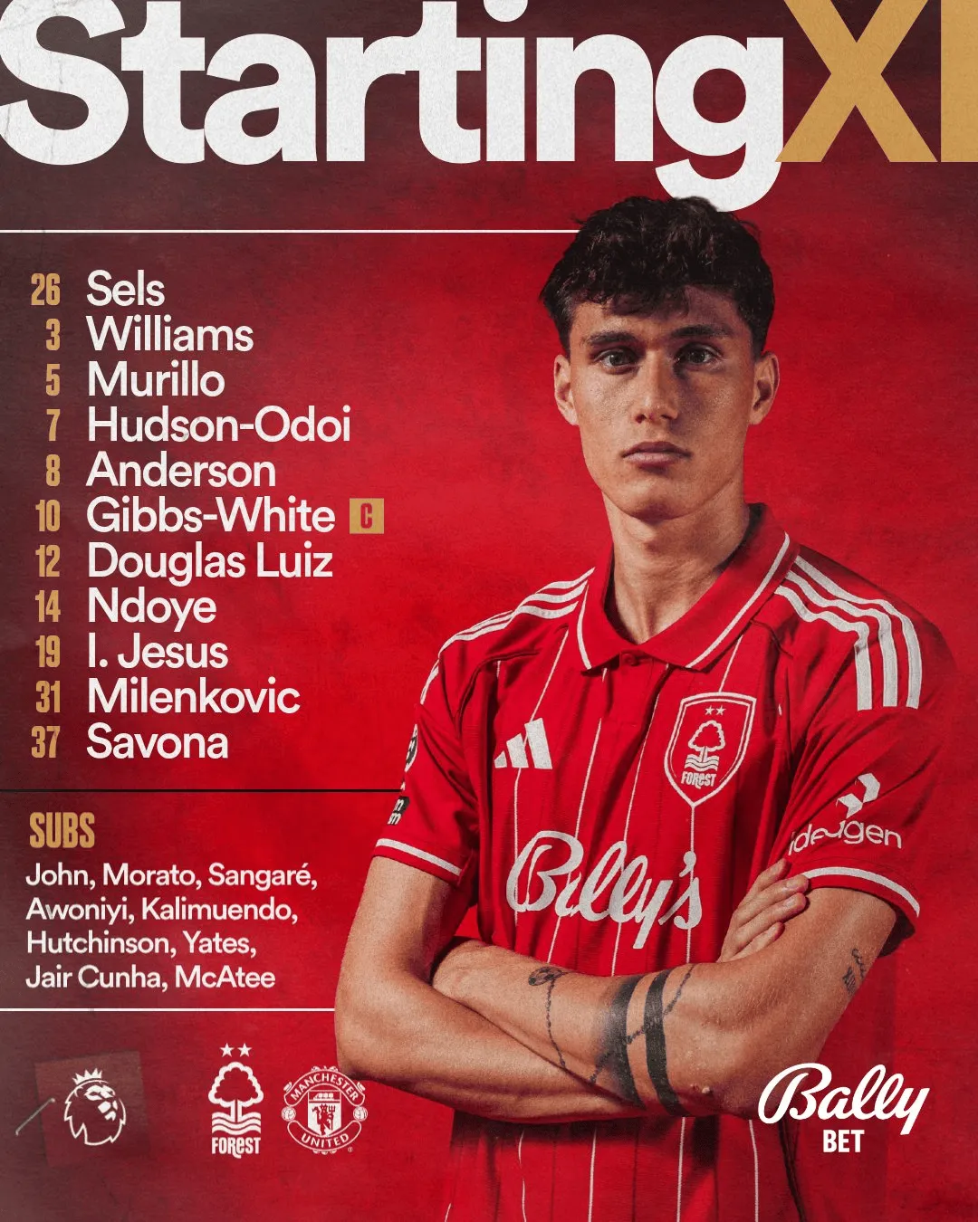諾丁漢森林替補:13-約翰-維克托、4-莫拉托、6-桑加雷、9-阿沃尼伊、15-卡利穆恩多、21-哈欽森、22-耶茨、23-賈伊爾、24-麥卡蒂