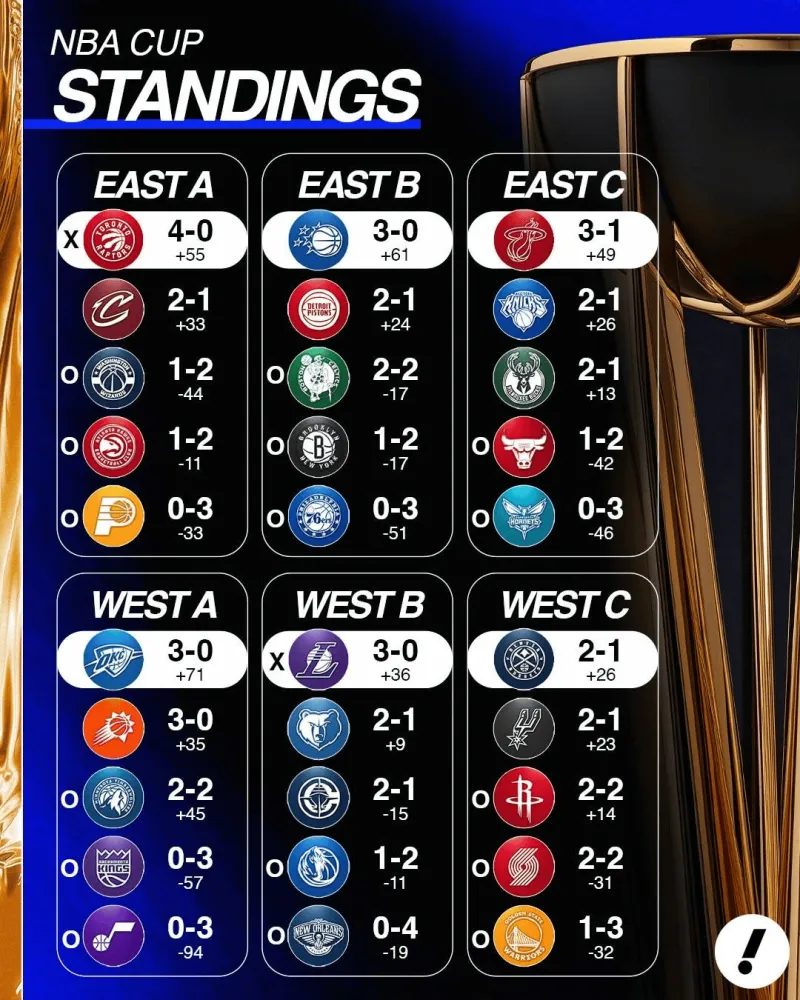 今日比賽結束后,目前猛龍本屆NBA杯六個小組的晉級形勢如下: