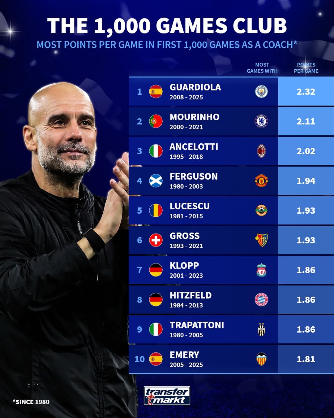 1. 瓜迪奧拉(2008-2025) - 2.32積分/場(chǎng)