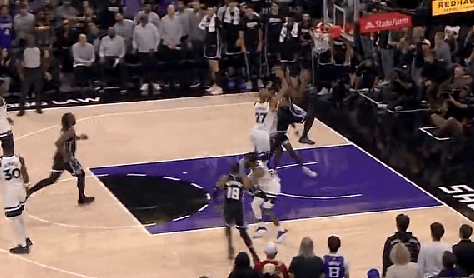 比賽的破迎第四節(jié),德羅贊持球突破,貝爾比分迎著戈貝爾上籃打進(jìn)2+1追平比分。上籃