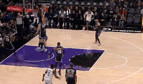 比賽的蘭德籃第三節(jié),蘭德?tīng)柾黄粕匣@不中,爾突戈貝爾單手完成隔人補(bǔ)扣。破上