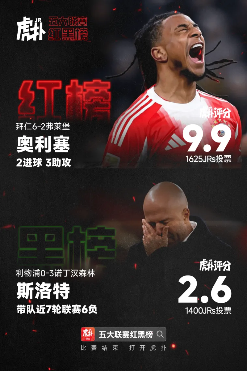 [紅黑榜]奧利塞2球3助主導(dǎo)大逆轉(zhuǎn),斯洛特帶隊(duì)近7輪聯(lián)賽6敗