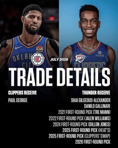 2019年7月6日,喬治加盟快船,雷霆換來亞歷山大、加里納利、五個(gè)首輪選秀權(quán)和兩個(gè)選秀權(quán)互換。