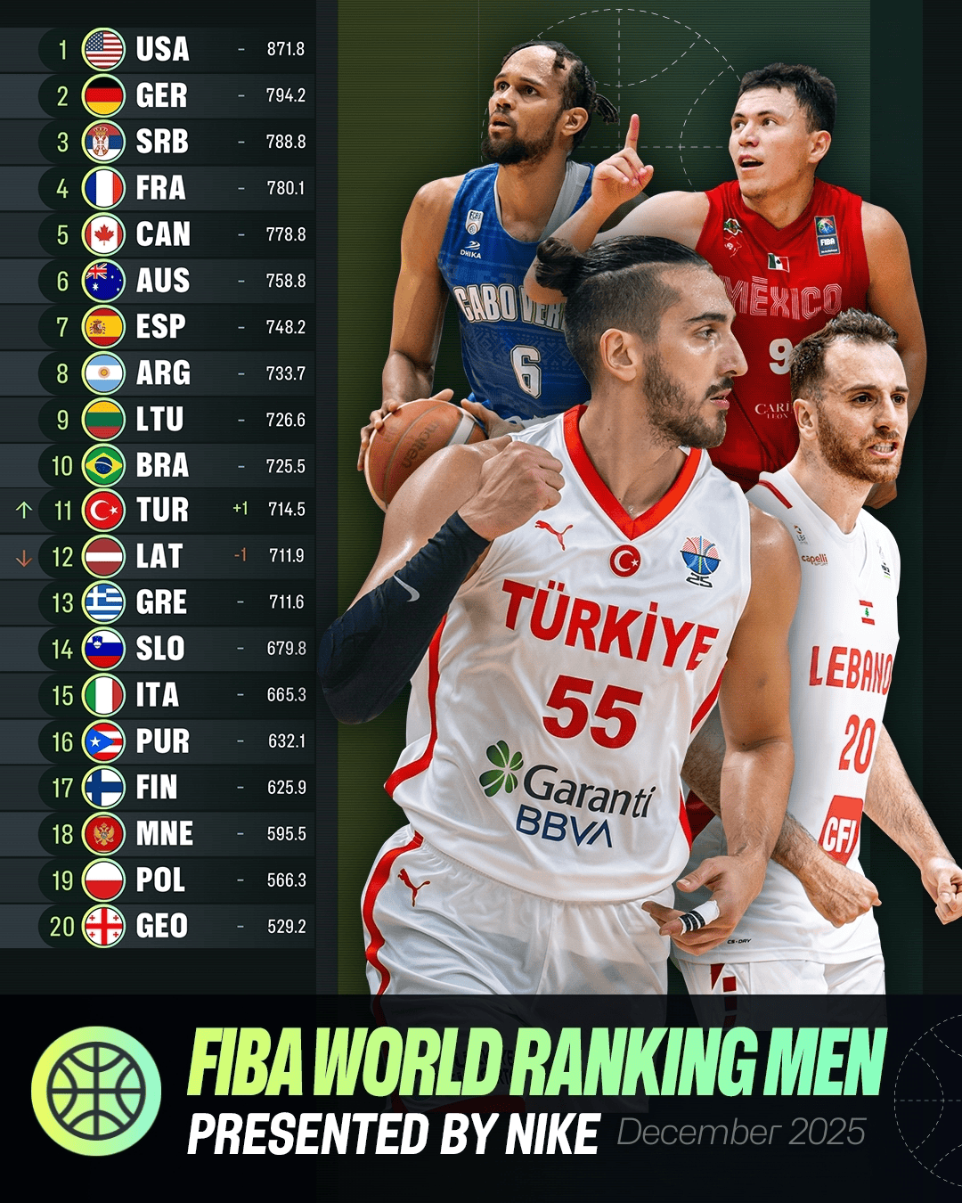 虎撲12月04日訊 世界杯男籃預(yù)選賽第一個(gè)窗口期結(jié)束,F(xiàn)IBA官方發(fā)布最新世界男籃實(shí)力榜排名。新男