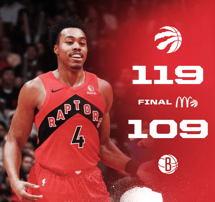 虎撲11月24日訊 今天NBA常規(guī)賽猛龍主場(chǎng)對(duì)陣籃網(wǎng)的比賽已經(jīng)結(jié)束。全場(chǎng)戰(zhàn)罷,分上分猛龍以119-109戰(zhàn)勝籃網(wǎng)。雙最
