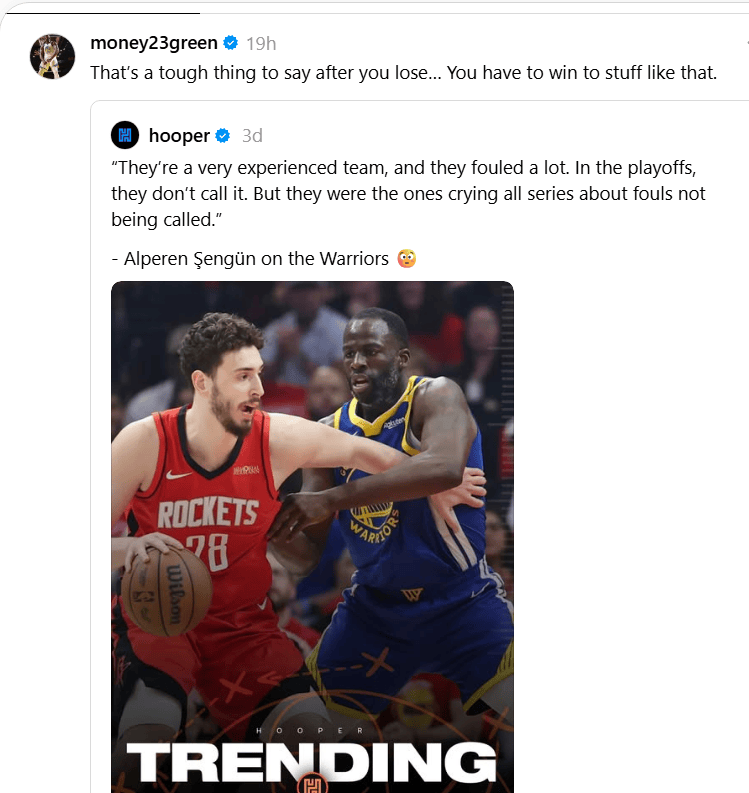 德雷蒙德-格林在今日回應(yīng)了申京,還說(shuō)其轉(zhuǎn)發(fā)了該報(bào)道并表示:輸球了之后還這么說(shuō)有點(diǎn)難繃...這是有點(diǎn)難繃贏家才能夠說(shuō)的話。