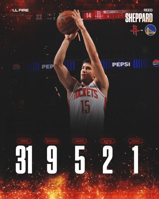 本場比賽,火箭球員里德-謝潑德出戰(zhàn)37分鐘,25投12中,其中三分球12投4中,罰球4投3中,得到31分9籃板5助攻1搶斷2封蓋。