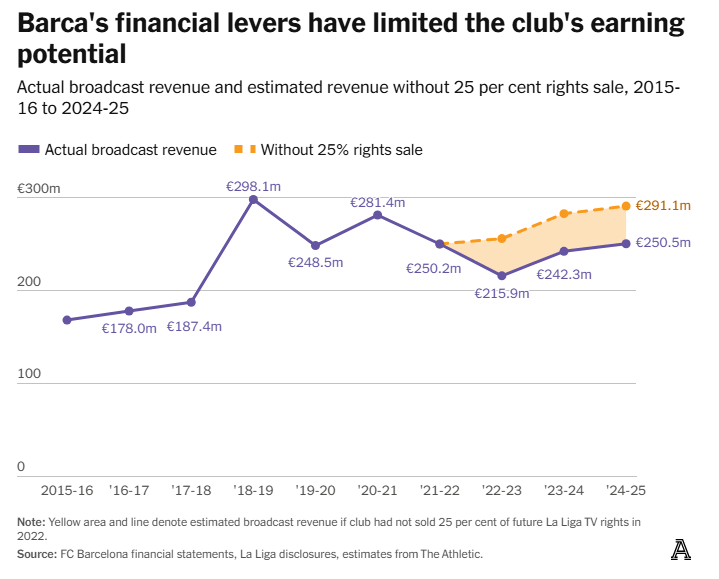 因此,上賽季巴薩的債務(wù)總額包含了該證券化基金的全部借款,無論這些借款是否已轉(zhuǎn)嫁給俱樂部。