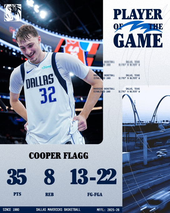本場比賽,年輕獨(dú)行俠球員庫珀-弗拉格出戰(zhàn)37分鐘,22投13中,其中三分球3投0中,罰球11投9中,得到35分8籃板2助攻。