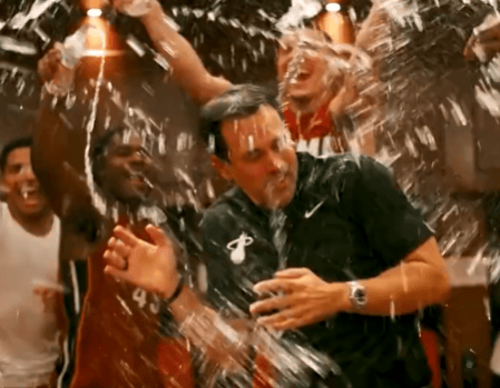 本場比賽獲勝后,熱火主帥埃里克-斯波爾斯特拉也收獲了執(zhí)教生涯第800場勝利。賽后,斯波被澆水慶祝。