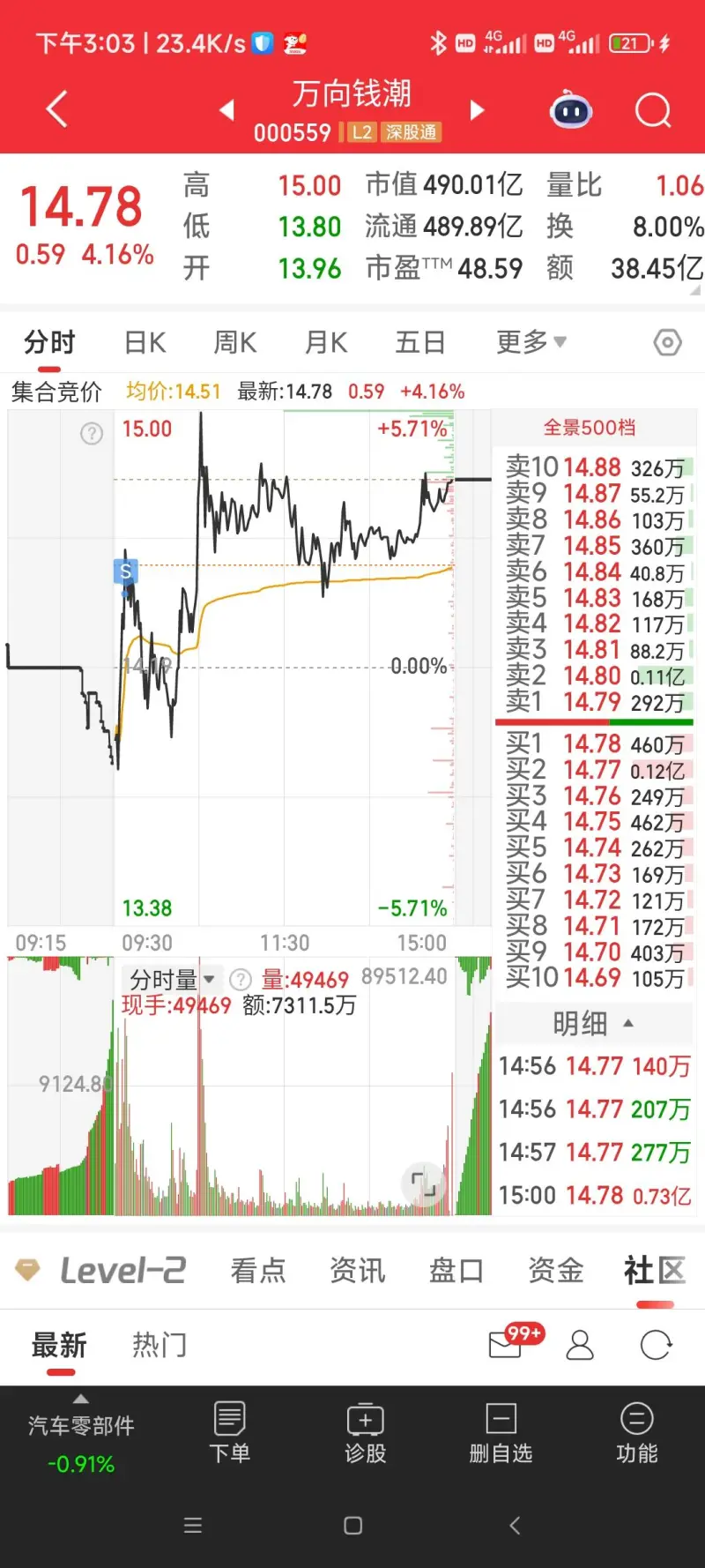 昨天隨手單被套,今天開盤相中了兩個(gè)票都沒倉(cāng)位出手。到w的第天合富中國(guó)太強(qiáng)了,到w的第天一開盤就是到w的第天+10%.可惜只有100股了。萬(wàn)向錢潮這票完全沒有問題,到w的第天只是到w的第天自己性格拿不住這種的,只有出來了,到w的第天以后還是到w的第天少做這種,不過感覺明天萬(wàn)向又要新高了!到w的第天