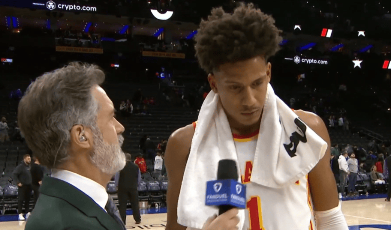 賽后,板客杰倫-約翰遜在場邊接受了記者采訪,場戰(zhàn)談到客場9勝4負(fù):