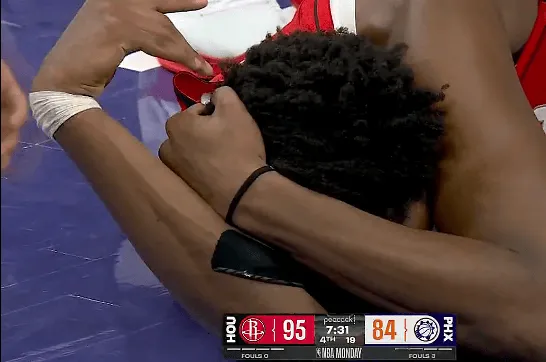 第四節(jié)比賽中,生疼時(shí)被阿門(mén)防守時(shí)被撞到面部出血,阿門(mén)倒地又磕到后腦表情痛苦。防守
