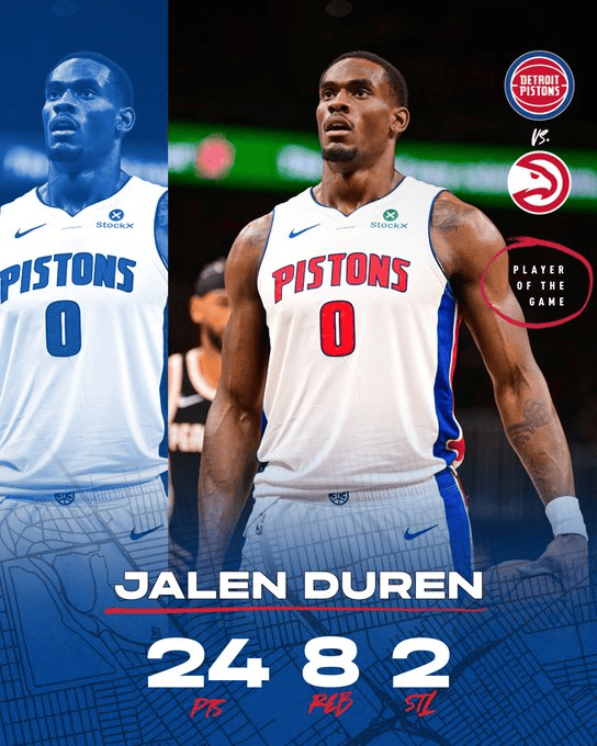 [流言板]活塞官方發(fā)布杜倫數(shù)據(jù)海報(bào):全場(chǎng)24分8板3助2斷,無(wú)需多言!