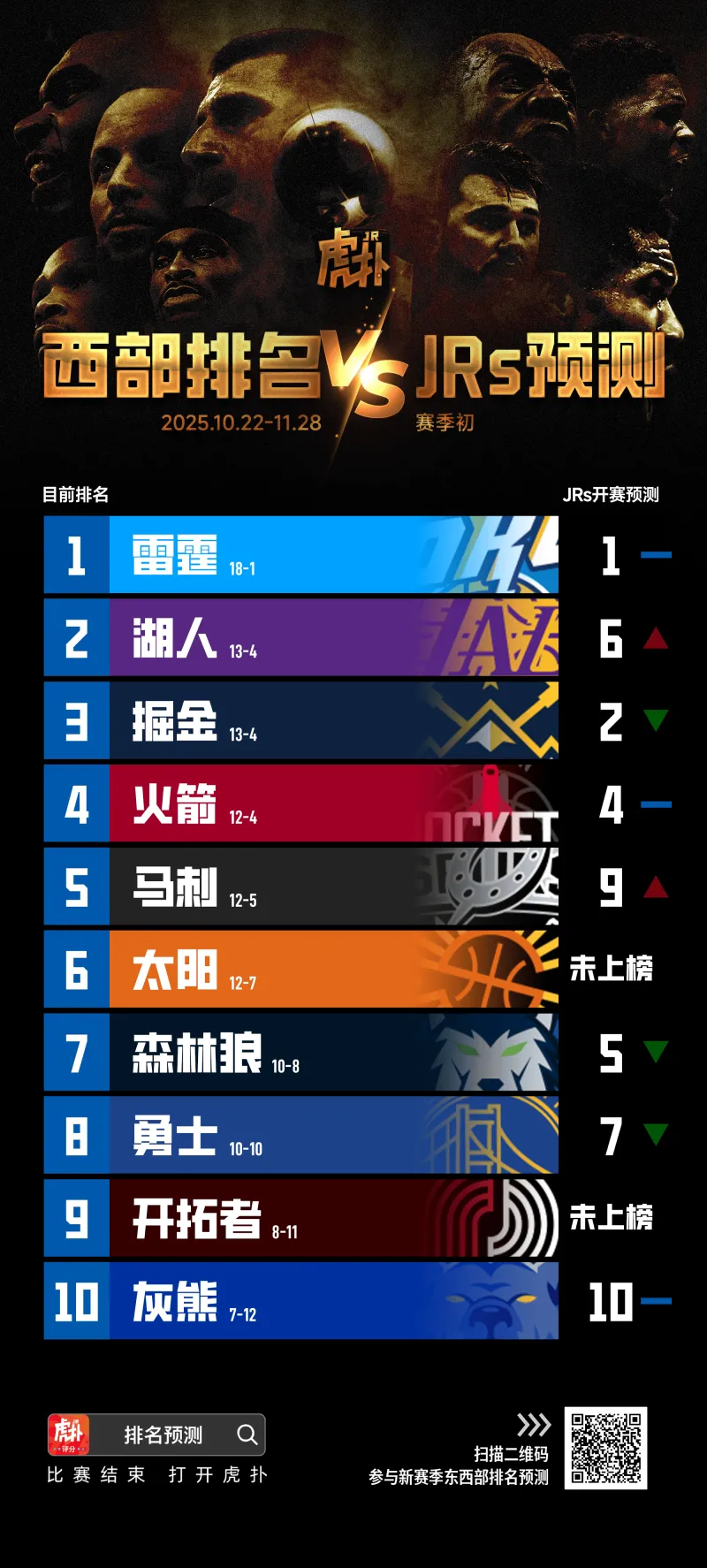 我們整理出了各隊(duì)當(dāng)前排名與JRs賽季前預(yù)測西部排名的湖人對比,西部前十名各隊(duì)分別如下: